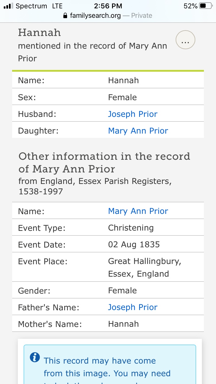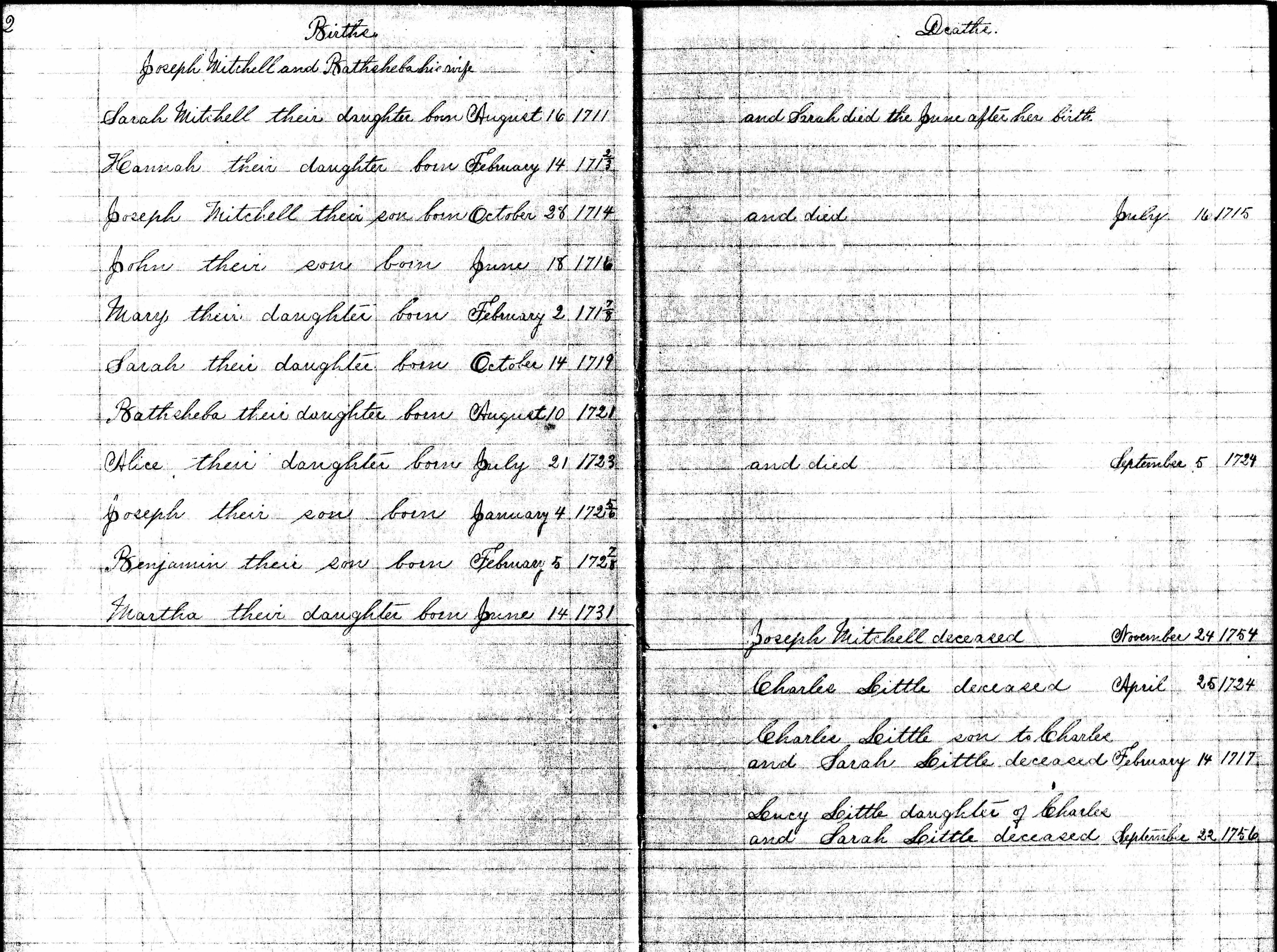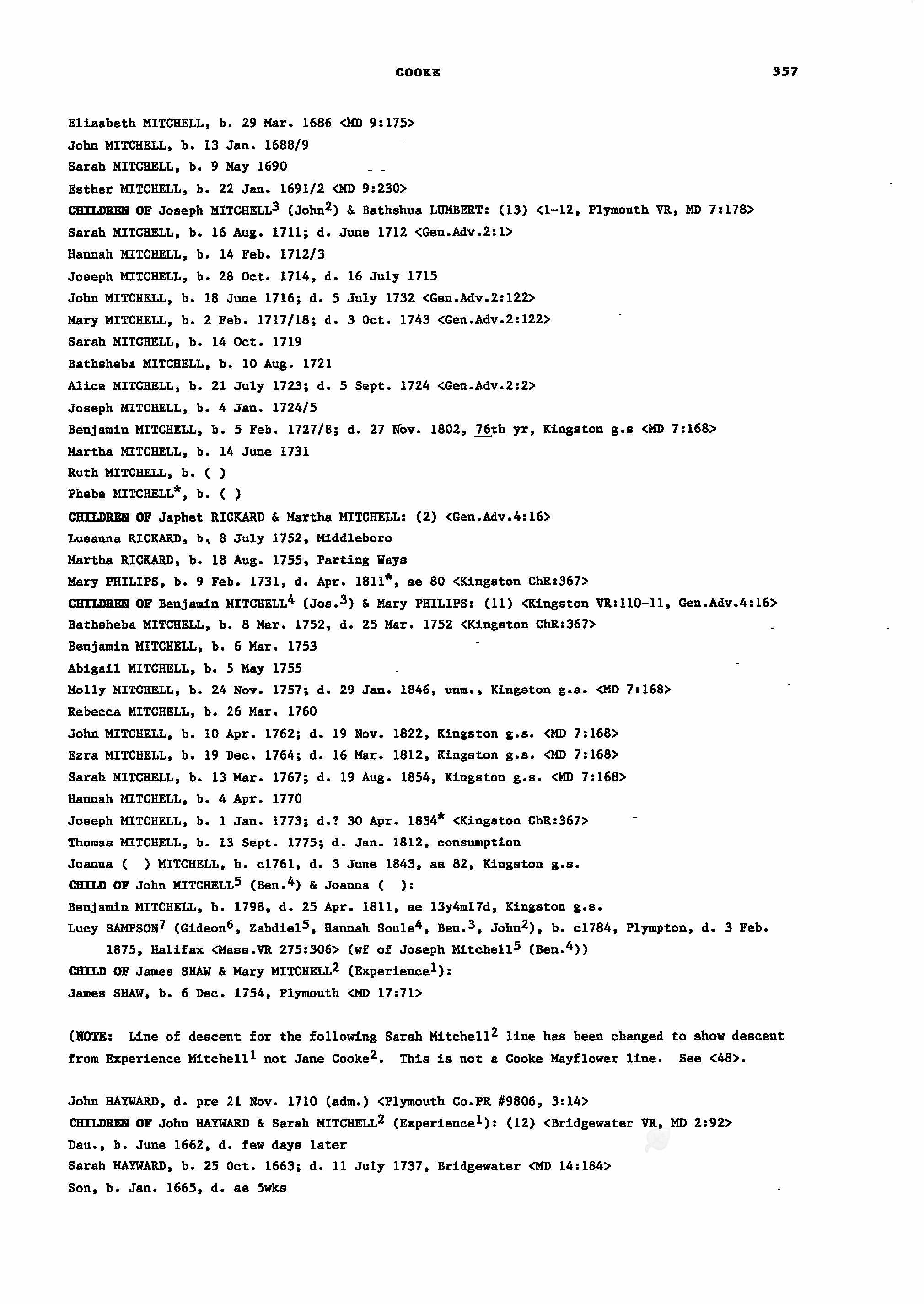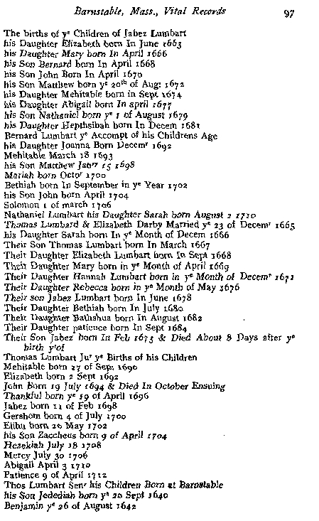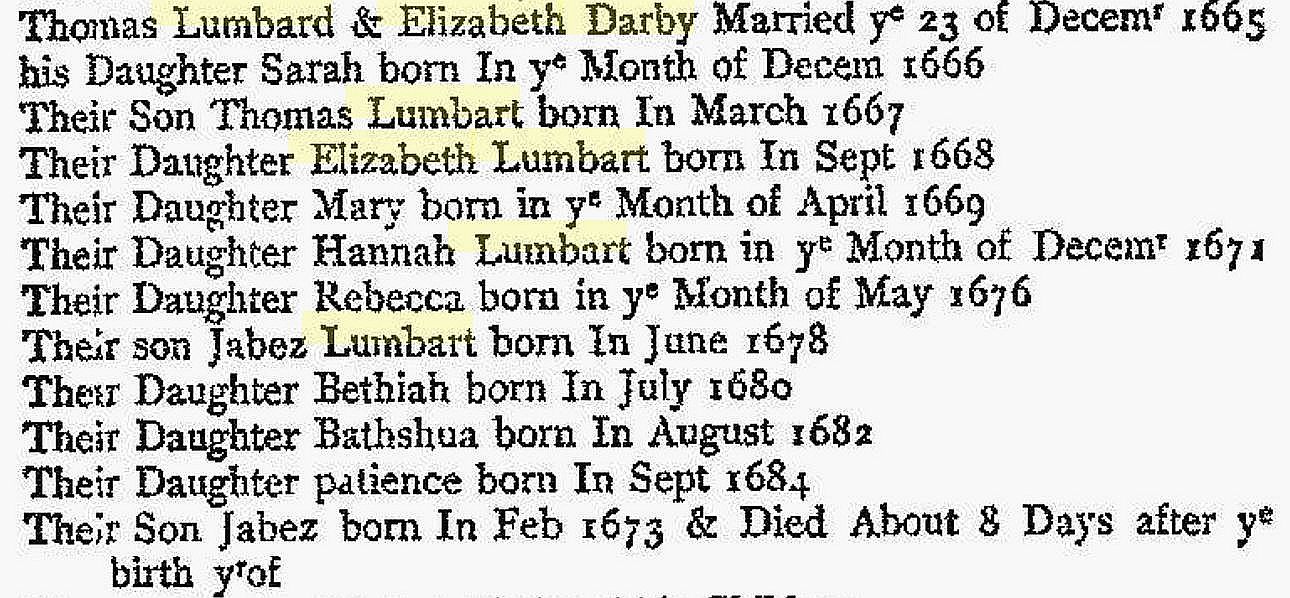 Home Surname List Name Index Sources | Pedigree Chart | 2 Joseph Mitchell99,195  | 4 John ingatius Mitchell | 8 | | b: m: d: | | b: about 1650 in Duxbury, Plymouth County, Massachusetts, United States of America196 m: 24 May 1682 in Duxbury196 d: 14 October 1719 in Duxbury, Plymouth County, Massachusetts, United States of America | 9 | | b: d: | | b: 13 March 1684 in Duxbury, Plymouth, Massachusetts, United States m: 12 October 1710 in Plymouth, Massachusetts d: 24 November 1754 in Kingston, Plymouth, Massachusetts, United States | 5 Mary Prior98,99,197,198  | 10 Joseph Prior | | b: 1623 in Watford, Watford Borough, Hertfordshire, England, United Kingdom1 m: 1650 in Scituate, Plymouth, Massachusetts, USA1 d: 14 August 1692 in Duxbury, Plymouth, Massachusetts, USA1 | | 1 Hannah Mitchell1  | b: 1660 in Duxbury, Plymouth, Colonial America, Massachusetts, USA1 d: 2 August 1725 in Providence, Providence, Colonial America, Rhode Island, USA1 | 11 Hannah Rogers | | b: 8 April 1625 in Duxbury, MA, Massachusetts, USA1 d: 17 October 1690 in Plymouth, Plymouth, Massachusetts, USA1 | | | | b: 8 April 1713 in Londonderry, Londonderry, Ireland5,23 m: 2 May 1748 in Virginia, United States d: 15 December 1760 in North Yarmouth, Cumberland, Maine, United States5,23 | 6 Thomas Lombard  | 12 | | b: m: d: | | 3 Bathshua Lombard98,195  | b: 1 July 1642 in Barnstable, Barnstable, Massachusetts, USA m: 1 December 1660 in Barnstable, Barnstable, Massachusetts, USA d: 1684 in Barnstable, Barnstable, Massachusetts, USA | 13 | | b: d: | | b: 4 August 1682 in Barnstable, Barnstable County, Crown Colony of Massachusetts Bay d: 21 January 1748 in Kingston, Plymouth County, Massachusetts, United States of America | 7 Sarah Elizabeth Derby1,96,199,200,201  | 14 John (Symonds) Derby | | b: 1610 in Burton Bradstock, West Dorset District, Dorset, England m: 1631 in Bridport, Dorset, England d: 4 October 1656 in Yarmouth, Barnstable County, Colony of Massachusetts Bay | | b: about 1646 in Yarmouth, Barnstable County, Crown Colony of Massachusetts Bay d: 23 December 1686 in Barnstable, Barnstable County, Crown Colony of Massachusetts Bay | 15 Alice (Unknown) Pearse | | b: 1614 in Burton Bradstock, Dorset, England d: 15 May 1691 in Yarmouth, Barnstable County, Colony of Massachusetts Bay | |