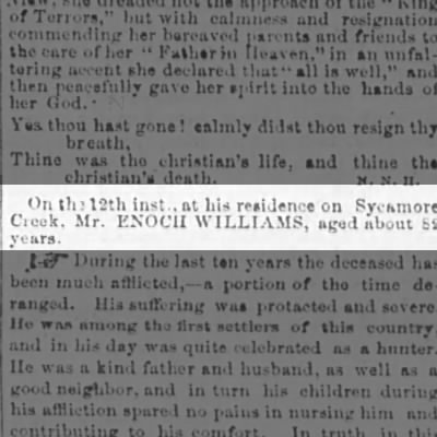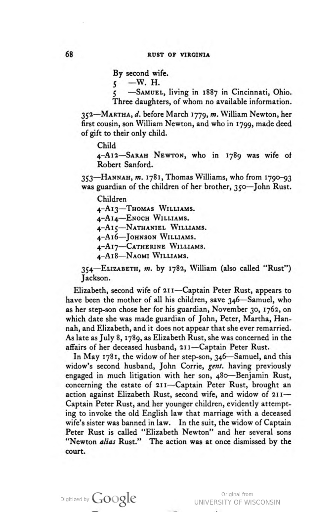 Home Surname List Name Index Sources | Pedigree Chart | 2 John Haselton Robinson  | 4 William Robinson  | 8 William Robinson Jr. |  | b: 1729 in Whitpain, Philadelphia, Pennsylvania, United States m: 6 December 1758 in Christ Church, Philadelphia, Pennsylvania, United States74 d: 1807 in Philadelphia, Philadelphia, Pennsylvania, United States | | b: 4 June 1766 in Philadelphia, Delaware, Pennsylvania, United States75 m: 14 March 1787 in Philadelphia, Philadelphia, Pennsylvania, United States74 d: 10 June 1852 in Mount Clare, Harrison, West Virginia, United States | 9 Susanna Sheed5,76  |  | b: February 1737 in Philadelphia, Philadelphia County, Pennsylvania, USA1,77 d: 22 May 1780 in Philadelphia, Philadelphia, Pennsylvania, United States | | b: 15 February 1809 in Clarksburg, Harrison, West Virginia, United States5,6,78,79 m: 30 January 1832 in Harrison, Charles, Virginia, United States80 d: 21 March 1878 in Clarksburg, Harrison, West Virginia, United States5 | 5 Mary Sherman | 10 | | b: m: d: | | 1 Rezin Reese Robinson1,3,4  | b: 30 October 1766 in Wilmington, New Jersey, United States d: 11 October 1835 in Mount Clare, Harrison, West Virginia, United States | 11 | | b: d: | | | | b: 4 September 1838 in Clarksburg, Harrison County, (West) Virginia, USA5,6,7,8,9,10,11,12 m: 8 October 1866 in Taylorstown, Washington, Pennsylvania, USA d: 13 July 1912 in Merna, Custer, Nebraska, United States5 | 6 Enoch Williams  | 12 Thomas Williams |  | b: 1756 in Westmoreland, Virginia, United States m: between 1750 and 1797 in Harrison County, West Virginia d: 18 January 1824 in Hampshire, Virginia, United States | | 3 Leah Lennah (Leanna) Williams  | b: 10 May 1770 in Coburn, Wetzel County, West Virginia, United States of America81 m: 14 September 1797 in Frederick County, Virginia, USA82,83 d: 12 April 1852 in Harrison, West Virginia, United States5 | 13 Hannah Brent Rust  |  | b: 1750 in Westmoreland, Virginia, United States d: 1824 in Harrison County, West Virginia, USA | | b: 15 June 1809 in Clarksburg, Harrison, Virginia, United States5,6,78,79 d: 17 April 1881 in Clarksburg, Harrison County, West Virginia, USA5 | 7 Lydia Felton1 | 14 Thomas Felton |  | b: 1740 in Virginia, United States m: d: in Virginia, United States | | b: 1 January 1780 in Loudoun County, Virginia, United States of America23 d: 11 June 1854 in Sycamore Creek, Harrison Co., West Virginia5,23 | 15 Jones Felton | | b: 1758 in Virginia, USA d: 1833 in Virginia, USA | |