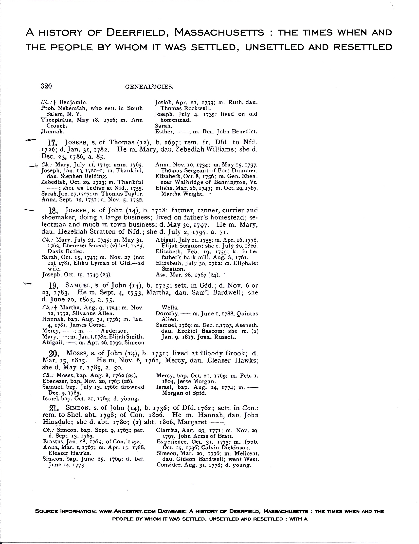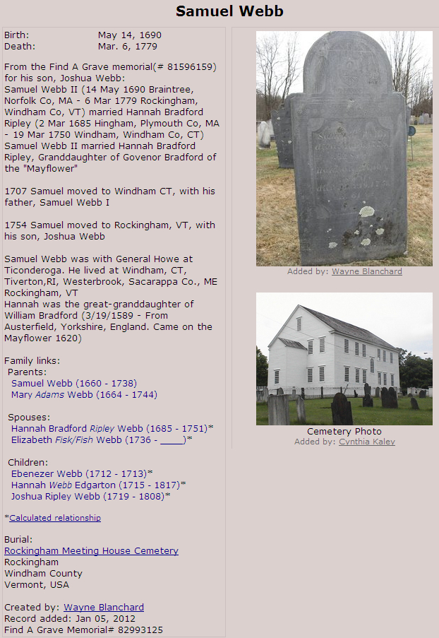 Home Surname List Name Index Sources | Pedigree Chart | 2 Azariah Webb  | 4 Joshua Ripley Webb1  | 8 Samuel Webb  | | b: 14 May 1690 in Braintree, Norfolk, Massachusetts, United States m: 8 October 1711 in Windham, Windham, Connecticut d: 6 March 1779 in Rockingham, Windham, Vermont, United States | | b: 9 February 1721 in Windham, Windham County, Connecticut, United States of America5,229 m: 28 May 1744 in Windham, Connecticut, USA229,230 d: 17 April 1808 in Rockingham, Windham County, Vermont, United States of America5,229 | 9 Hannah Bradley Ripley  | | b: 2 March 1684 in Hingham, Plymouth, Massachusetts, United States d: 19 March 1751 in Rockingham, Vermont, USA | | b: 12 December 1748 in Windham, Windham, Connecticut, United States5,92,98,231,232,233 m: about 1764 d: 12 April 1846 in Lunenburg, Essex County, Vermont, USA5,92,232,233 | 5 Hannah Abbe234  | 10 John Abbe  | | b: 20 April 1691 in Windham, Windham, Connecticut, USA5,235 m: 1717 in Windham, Connecticut, USA d: 16 January 1771 in Windham, Windham, Connecticut, USA5,235 | | | 1 Ashbel Patterson Webb1 | b: 17 September 1724 in Windham, Windham County, Connecticut, United States of America5,106,233 d: 12 February 1815 in Rockingham, Vermont, USA5,106,233 | 11 Mary Palmer99,207  | | b: 17 December 1691 in Rehoboth, Bristol, Massuchesetts, USA5,235,236 d: 30 November 1750 in Rehoboth, Bristol, Massachusetts, USA5,235 | | | | b: 21 September 1772 in Piermont, Grafton, New Hampshire, United States5 m: d: 27 March 1813 in Lunenburg, Essex, Vermont, United States5 | 6 Bildad Andrews (Andross)1  | 12 John Andrews | | b: 8 May 1685 in Farmington, Hartford, Connecticut, USA92,237,238,239 m: 26 April 1716 in Farmington, Hartford, Connecticut, United States d: 16 April 1761 in Farmington, Hartford, Connecticut, USA238 | | 3 Lucy Andrews  | b: 12 May 1719 in Farmington, Hartford, Connecticut, United States5,92,134,237,240,241,242 m: 11 April 1750 in Northfield, Franklin, Massachusetts, United States99 d: 27 November 1802 in Bradford, Orange, Vermont, United States5,92,134 | 13 Elizabeth Orvis  | | b: 1 October 1693 in Farmington, Hartford, Connecticut, United States d: 23 November 1772 in Southington, Hartford, Connecticut, United States | | b: 23 March 1755 in Northfield, Franklin County, Massachusetts, United States of America5,92,232,233 d: 6 October 1803 in Lunenburg, Essex County, Vermont, United States of America5,92,232,233 | 7 Mary Stebbins  | 14 Joseph Stebbins  | | b: 30 March 1697 in Northampton, Hampshire, Massachusetts, United States5 m: 19 February 1718 in Bradford, Essex, Massachusetts, USA243 d: 31 January 1782 in Northfield, Franklin, Massachusetts, United States5 | | b: 11 July 1719 in Deerfield, Franklin, Massachusetts, United States5,92 d: 30 April 1790 in Bradford, Orange, Vermont, United States5 | 15 Mary Williams1  | | b: 13 February 1701 in Northampton, Hampshire County, Massachusetts, United States of America5 d: 23 December 1786 in Northfield, Franklin, Massachusetts, USA5 | |