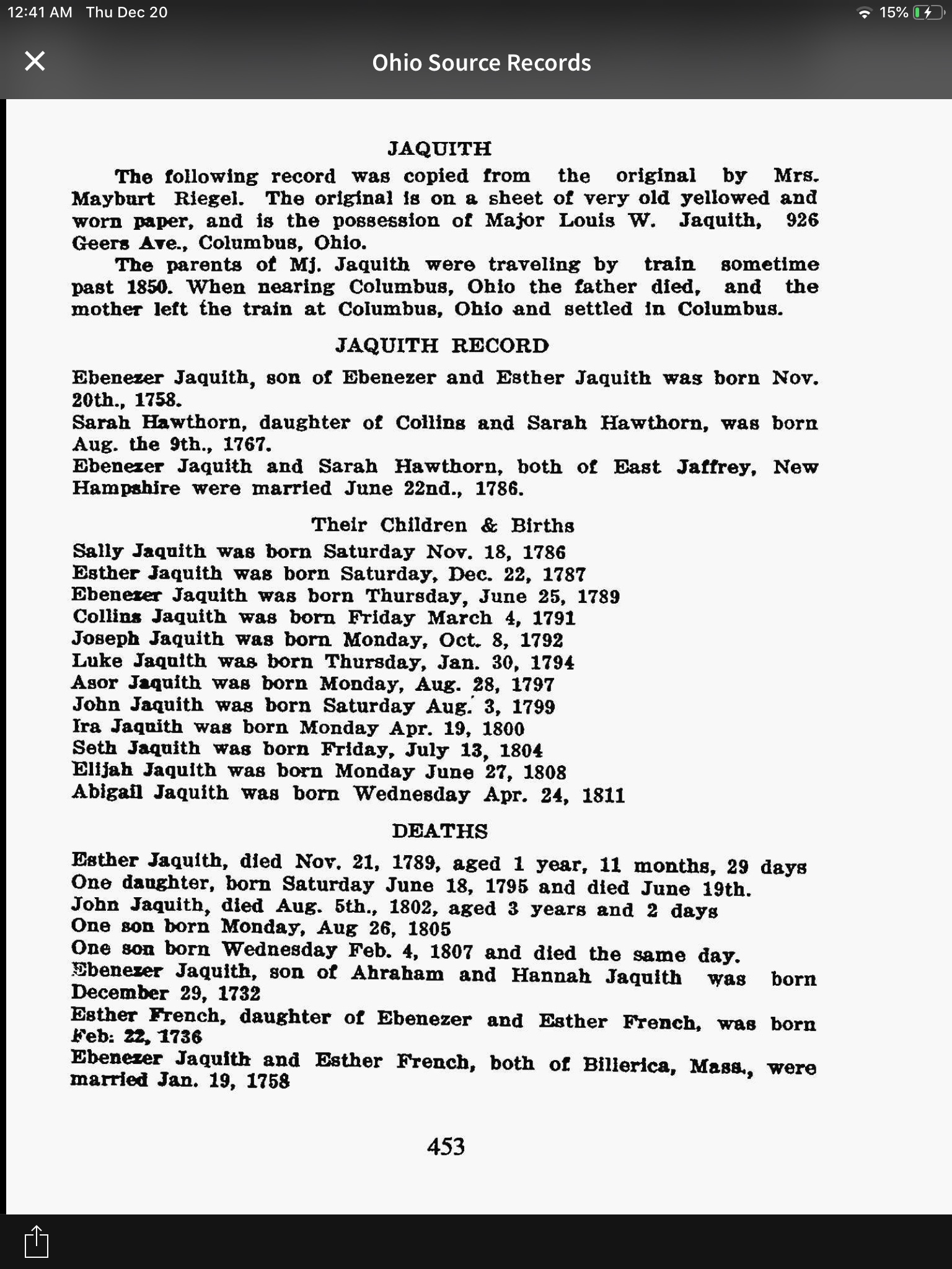 Home Surname List Name Index Sources | Pedigree Chart | 2 Collins Hathorn  | 4 Ebenezer Hathorn Jr96,99,146,258 | 8 Ebenezer Hathorne | | b: 6 March 1655 in Lynn, Essex, Massachusetts, United States m: 26 Dec 1683 (Esther Witt) in Salem, Essex, Massachusetts d: 1719 in Lynn, Essex, Massachusetts | | b: 7 July 1705 in Lynn, Essex, Province of Massachusetts bay, New England m: 11 October 1730 in Lynn, Essex, Province of Massachusetts bay, New England d: 1737 in Lynn, Essex, Massachusetts, United States | 9 Esther Witt Hathorne | | b: 5 December 1664 in Lynn, Essex, Massachusetts, United States d: after 1721 in Lynn, Essex, Massachusetts, United States | | b: 1735 in Lynn, Essex County, Massachusetts, United States of America175 m: 9 July 1761 in Wilmington, Middlesex, Massachusetts268 d: about 1788 in Jaffrey, Cheshire County, New Hampshire, United States of America148,175 | 5 Keziah Collins96,99,146,258 | 10 Eleazer Collins Sr. | | b: 9 October 1673 in Lynn, Essex, Massachusetts, United States m: 23 December 1699 in Lynn, Essex, Massachusetts, USA d: 5 July 1725 in Lynn, Essex, Massachusetts, United States | | 1 Sarah (Sally) Hathorn140,142  | b: 27 November 1704 in Lynn, Essex, Province of Massachusetts bay, New England d: in Massachusetts, Massachusetts, USA1 | 11 Rebecca Newhall | | b: 6 December 1670 in Lynn, Essex, Massachusetts, United States d: 4 July 1739 in Lynn, Essex, Massachusetts, United States | | | | b: 9 August 1767 in Jaffrey, Cheshire, New Hampshire, USA5,143,144,145 m: 1783143 d: 19 May 1834 in Jaffrey, Cheshire, New Hampshire, USA5,143,144,145 | 6 William Edward Dean1 | 12 Lieut. John Dean Sr  | | b: 25 June 1677 in Woburn, Middlesex, Massachusetts, United States m: about 1700 in New England, Colonial America d: February 1751 in Woburn, Middlesex, Massachusetts, United States | | 3 Sarah Dean  | b: 7 May 1706 in Woburn, Middlesex, Massachusetts, USA m: 10 March 1736 in Woburn, Middlesex, Massachusetts, USA269 d: about 1800 in Jaffrey, Cheshire, New Hampshire, USA | 13 Mary Dean | | b: 3 November 1675 in Billerica, Middlesex, Massachusetts, United States d: 26 March 1719 in Woburn, Middlesex, Massachusetts, United States | | b: 17 November 1740 in Burlington, Middlesex, Massachusetts, USA5,96 d: 10 May 1812 in Reading, Windsor County, Vermont, United States of America5,233 | 7 Sarah Underwood1 | 14 Jonathan Underwood | | b: 18 August 1686 in Lexington Middlesex, Massachusetts, USA m: 17 November 1704 in Cambridge, Middlesex, Massachusetts d: 1743 in Watertown, Middlesex, Massachusetts, United States | | b: 10 May 1714 in Lexington, Middlesex, Massachusetts, USA145 d: 8 February 1794 in Jaffrey, Cheshire, New Hampshire, USA145 | 15 Ruth Holland | | b: 7 May 1690 in Watertown, Middlesex, Massachusetts, United States d: 16 March 1798 in Watertown, Middlesex, Massachusetts, United States | |