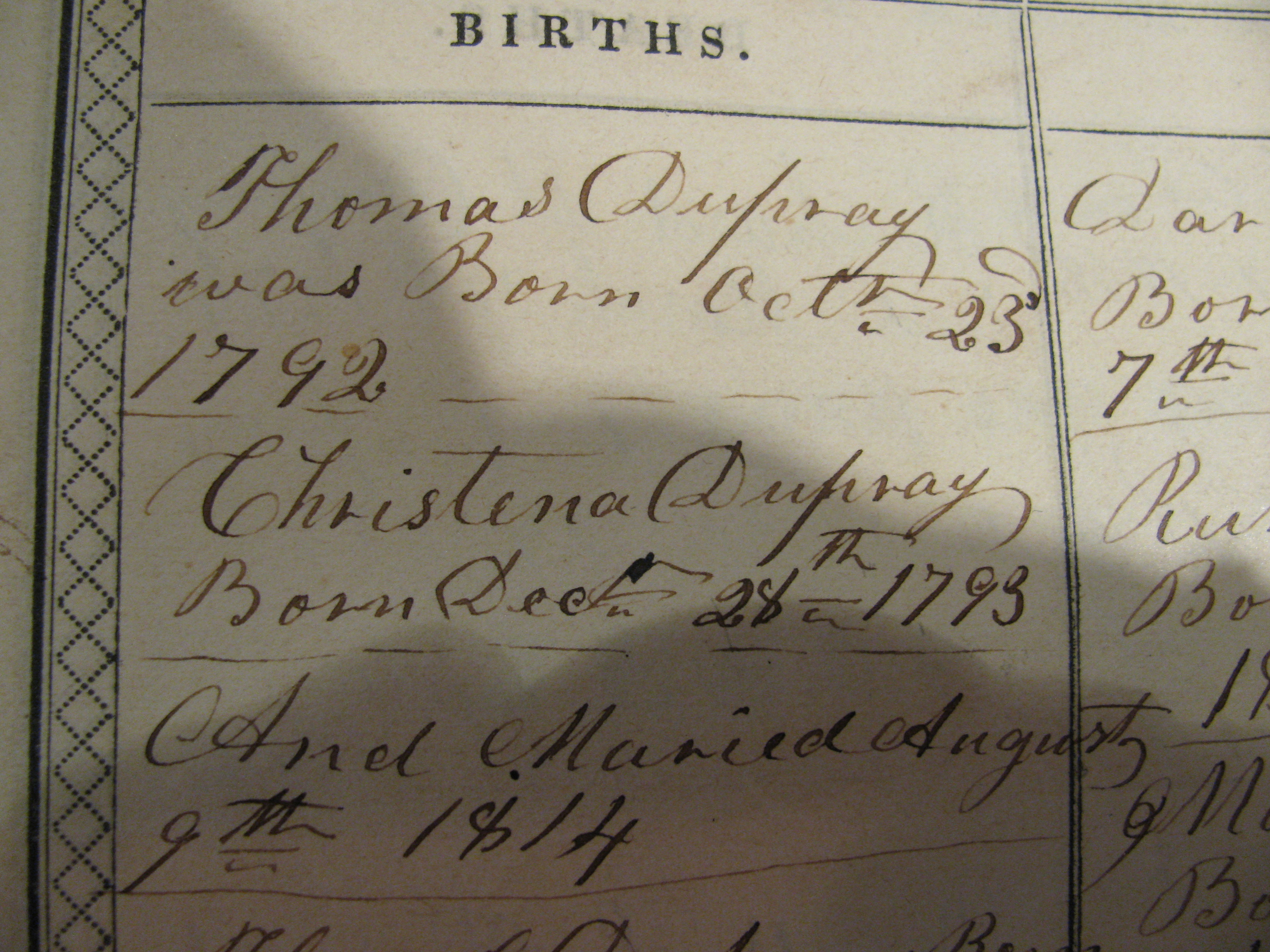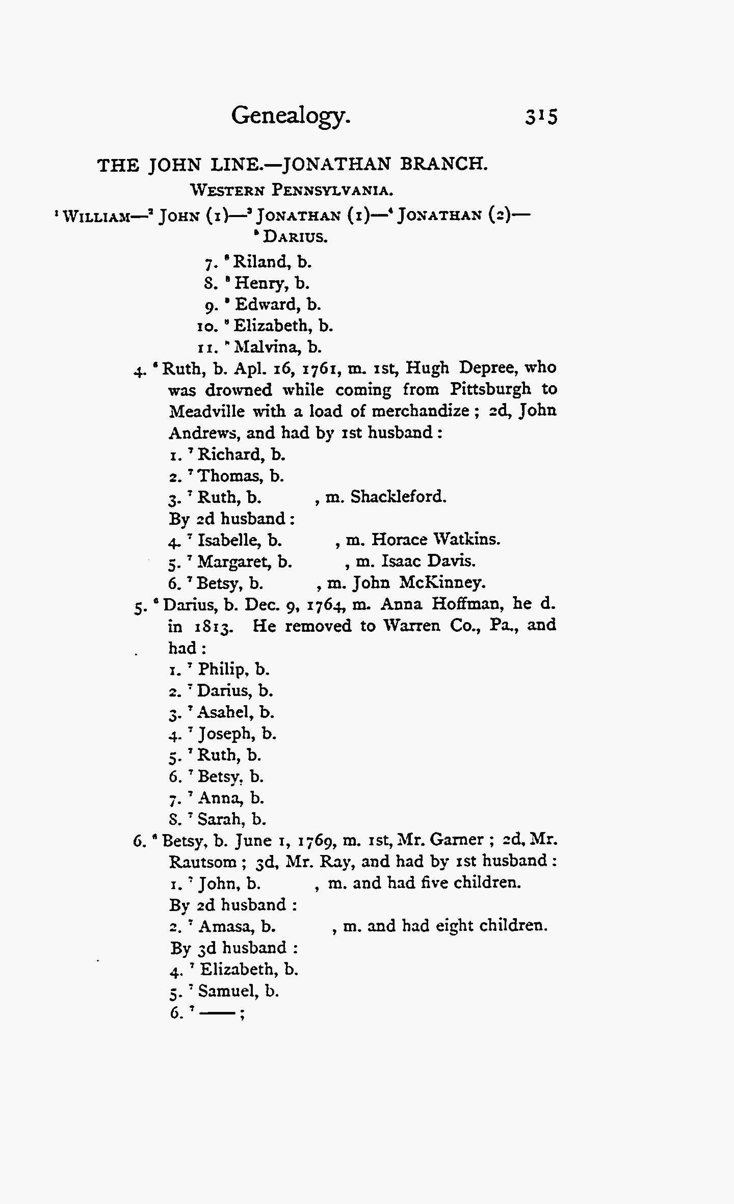 Home Surname List Name Index Sources | Pedigree Chart | 2 Frederick Miller Dupray1,21  | 4 Thomas Dupray1  | 8 Hugh Dupray1  |  | b: 1750 in Hudson, Columbia, New York, USA m: 1785 in Meadville, Crawford, Pennsylvania, USA d: 1794 in Meadville, Crawford, Pennsylvania, USA | | b: 23 October 1792 in Meadville, Crawford, Pennsylvania, USA105,106,107,108,109 m: 9 August 1814 in Venago County, Pennsylvania, United States106,109 d: 19 October 1852 in Clarinda, Page, Iowa, USA105,106,109 | 9 Ruth Mead1  |  | b: 16 April 1761 in Hudson, Columbia, New York, USA97,110 d: 11 February 1817 in Steubenville, Warren, Pennsylvania, USA | | b: 12 October 1831 in Charleston, Portage, Ohio, United States,5,35,40,105,108,111,112,113,114,115,116 m: 8 January 1860 in Big Grove, Atchison, Missouri, USA112 d: 9 January 1914 in Ferndale, Whatcom County, Washington, United States of America5,105,113,114,116,117,118 | 5 Christina Miller29,119  | 10 | | b: m: d: | | 1 Cora Elenora Dupray21,22,32  | b: 28 December 1793 in Somerset, Somerset, Pennsylvania, USA5,105,109,120 d: 30 September 1850 in Richland, Jackson, Iowa, USA5,105,106,109,121 | 11 | | b: d: | | | | b: 14 October 1860 in Big Grove, Pottawattamie, Iowa, United States,5,33,34,35,39,40,41 m: 10 January 1880 in Logan, Harrison, Iowa33,39 d: 7 August 1919 in Omaha, Douglas, Nebraska, United States5,41 | 6 Harvey Webb | 12 Ashbel Patterson Webb1 |  | b: 21 September 1772 in Piermont, Grafton, New Hampshire, United States5 m: d: 27 March 1813 in Lunenburg, Essex, Vermont, United States5 | | 3 Nancy Keziah Webb  | b: 24 July 1798 in Lancaster Coos Co. New Hampshire107,122,123,124 m: 1821 in Moriah, Essex, New York, USA d: 1885 in Nebraska City, Otoe, Nebraska, USA | 13 Sarah Sally Bushnell | | b: 26 September 1790 in NH d: 4 February 1878 in Johnston, Trumbull County, Ohio, United States of America | | b: 19 July 1837 in Moriah, Essex County, New York, United States of America5,35,40,67,105,111,112,113,114 d: 10 August 1915 in Ferndale, Whatcom County, Washington, United States of America5,105,113,114,125,126 | 7 Sarah Reed29 | 14 | | b: m: d: | | b: 1798 in Granville, Washington, New York, USA127,128,129 d: 21 September 1879 in Nebraska City, Otoe, Nebraska, United States127 | 15 | | b: d: | |