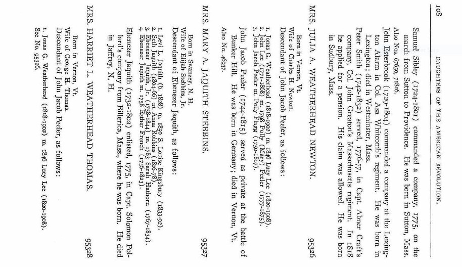 Home Surname List Name Index Sources | Pedigree Chart | 2 Benjamin Homer Jaquis  | 4 Benjamin Homer Jaquis | 8 Ebenezer Jaquith139,140,141,142  |  | b: 20 November 1758 in Billerica, Middlesex County, Massachusetts, United States of America5,99,143,144,145,146,147 m: 1783143 d: 19 June 1844 in Jaffrey, Cheshire, New Hampshire5,143,144,145,148 | | b: about 1790 in Jaffrey, Cheshire, New Hampshire, United States130,149,150 m: estimated 1809 in Vermont, United States d: 1859 in Wilmington, Essex, New York, United States | 9 Sarah (Sally) Hathorn140,142  |  | b: 9 August 1767 in Jaffrey, Cheshire, New Hampshire, USA5,143,144,145 d: 19 May 1834 in Jaffrey, Cheshire, New Hampshire, USA5,143,144,145 | | b: 12 August 1810 in Fairlee, Orange, Vermont, USA151,152 m: 21 January 1838 in Clinton, Clinton, New York, United States d: 28 July 1872 in Butte, California, USA153,154 | 5 Mary Richardson  | 10 | | b: m: d: | | 1 Elizabeth E Jaquis  | b: 1786 in France5,130,149 d: 13 May 1857 in Wilmington, Essex, New York, United States5 | 11 | | b: d: | | | | b: 26 October 1838 in Blackbrook,Clinton,New York,USA5,47,48,50,51,55,67 m: 17 April 1857 in New Hartford, Butler, Iowa, United States d: 16 November 1916 in Meeker, Lincoln, Oklahoma, USA5 | 6 Richard Lashbrook  | 12 William Lashbrook |  | b: 15 January 1754 in of Thornbury, Devon, England m: 18 February 1779 in Milton Damerel,Devon,England d: April 1857 in East Stonehouse, Devonshire | | 3 Fannie Hannah Lashbrook  | b: 29 June 1793 in Devonshire, England5,155,156,157,158 m: 6 September 1814 in Thornbury, Devon, , England d: 19 January 1882 in McHenry County, Illinois, United States of America5,159 | 13 Francis Shapton |  | b: December 1759 in Milton Damarel, Devon, England d: 1827 in Thornbury, Devon, England, United Kingdom1 | | b: 9 January 1819 in Bulkworthy, Torridge District, Devon, England5,67,160,161,162 d: 10 March 1883 in Alma, Harlan County, Nebraska, United States of America5 | 7 Ann Newcombe  | 14 Thomas Newcombe |  | b: about 1766 in Devon, England m: 24 December 1787 in Milton Damerel,Devon,England d: 1843 | | b: 30 June 1793 in South Tawton, Devon, England155,156,157,158 d: 11 May 1883 in McHenry, McHenry, Illinois, United States5,159 | 15 Mary Fishleigh | | b: about 1771 in Milton Damer, Devonshire, England1 d: | |